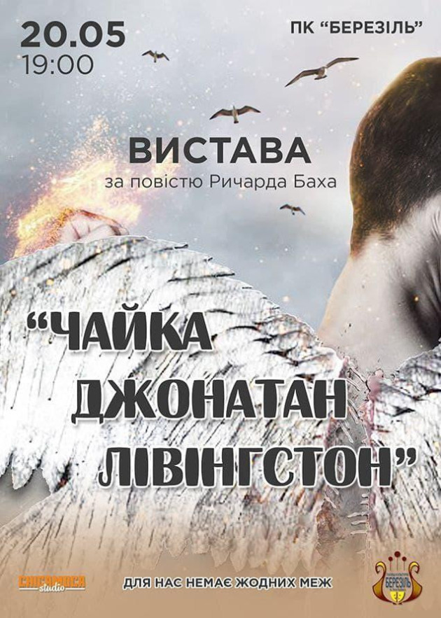 20 мая 2021 року в ПК “Березіль” відбудеться вистава “Чайка Джонатан Лівінгстон” в Тернополі за однойменною притчею Річарда Баха. Ця історія про птахів. І про людей. Про натовп і особистість. Про бажання і потреби. Про мрію і мистецтво польоту. Про те, що жити і їсти - зовсім не одне і те ж саме. Про те, як одна чайка з сотень тисяч вирішила змінити своє життя і змогла змінити цілий світ.